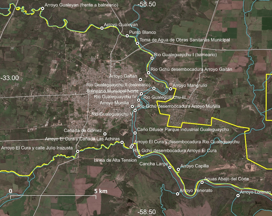 Objetivo: conocer la calidad del agua superficial del Río Gualeguaychú aguas arriba, aguas abajo como así también dentro del ejido de la ciudad.