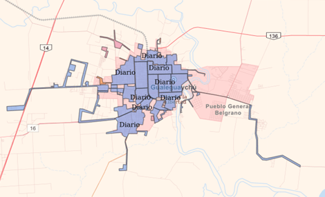 Se encuentra 230 km al noroeste de la ciudad de Buenos Aires y aproximadamente a 30 km al oeste de la frontera nacional con la República Oriental del Uruguay. Además, es la puerta de acceso al Corredor Turístico del Río Uruguay y está conectada con el interior del Departamento Gualeguaychú a través de las Rutas Provinciales pavimentadas N°16, N°20 y N°42.