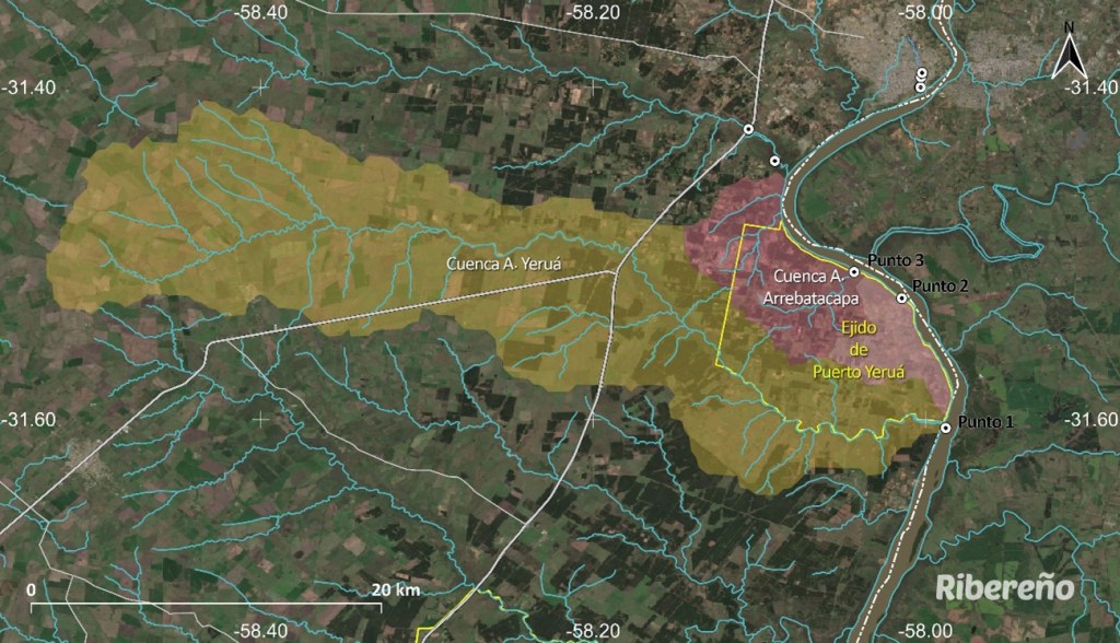 La cuenca completa del A. Yeruá tiene unas 42.500 ha. El sector final de esta cuenca está dentro del ejido de Puerto Yeruá, y el curso principal del arroyo constituye su límite sur.